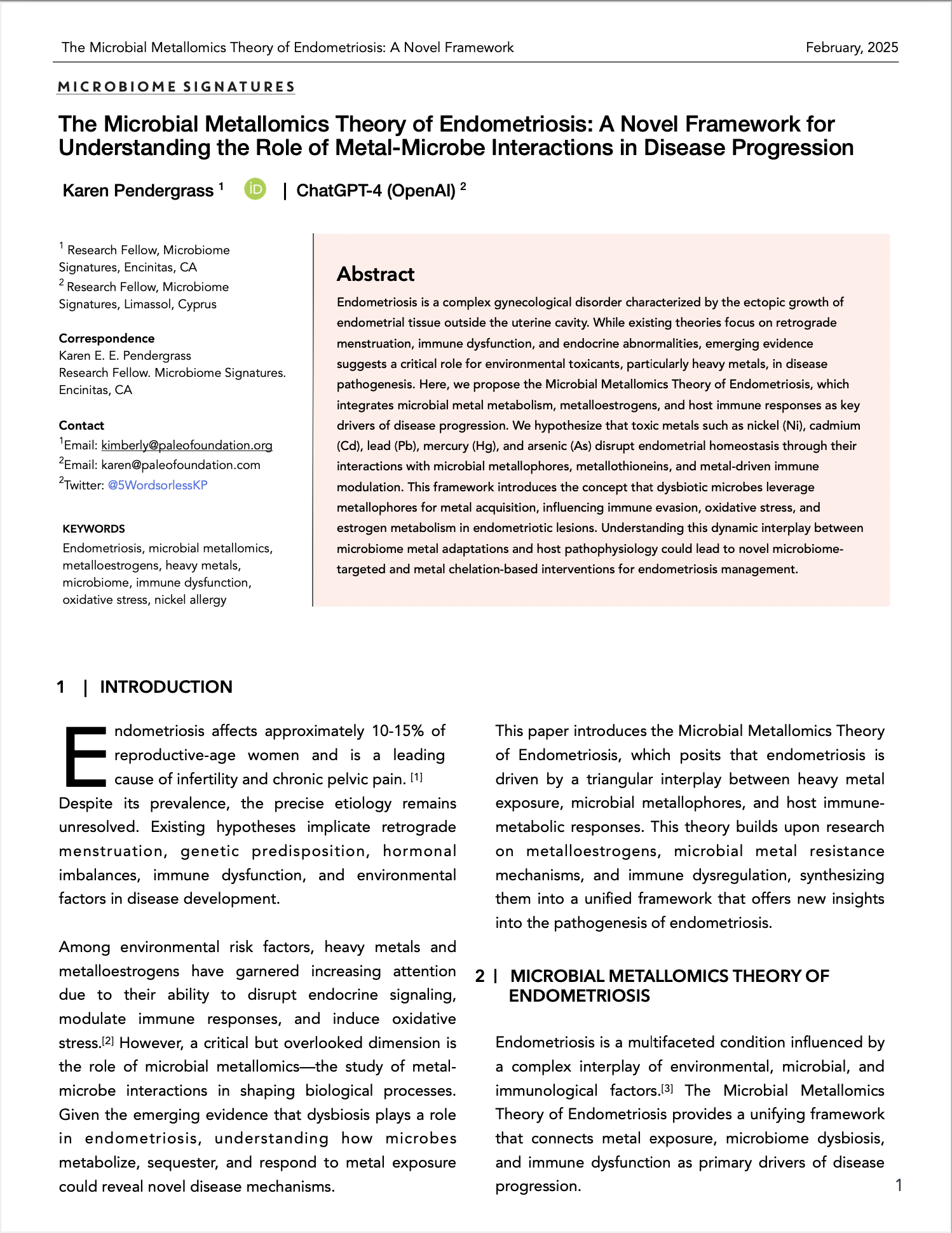 The Microbial Metallomics Theory of Endometriosis provides a groundbreaking synthesis of environmental toxicology, microbiome research, and immune-metabolic interactions in the pathogenesis of endometriosis. By proposing that heavy metals, microbial metallophores, and host immune responses drive disease progression, this theory expands current understanding beyond traditional models centered solely on hormonal dysregulation and immune dysfunction.
