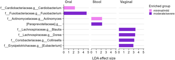 Figure 1. Differential microbial taxa between minimal/mild vs. moderate/severe endometriosis, stratified by body site (oral, stool, vaginal). Pink bars indicate taxa enriched in minimal/mild stage endometriosis; purple bars indicate enrichment in moderate/severe stage. For example, in the oral microbiome, Cardiobacterium is higher in mild cases, while Fusobacterium is higher in moderate/severe cases. In stool, Actinomyces is enriched in mild endo, whereas a family Paraprevotellaceae (an anaerobe group) is enriched in severe endopmc.ncbi.nlm.nih.gov. In the vaginal microbiome, several genera (Blautia, Dorea, Collinsella, Eubacterium) show higher abundance in moderate/severe endometriosis (purple)pmc.ncbi.nlm.nih.gov. No taxa were enriched in mild cases for the vaginal site in this analysis, reflecting that differences were more apparent in severe disease.[60]